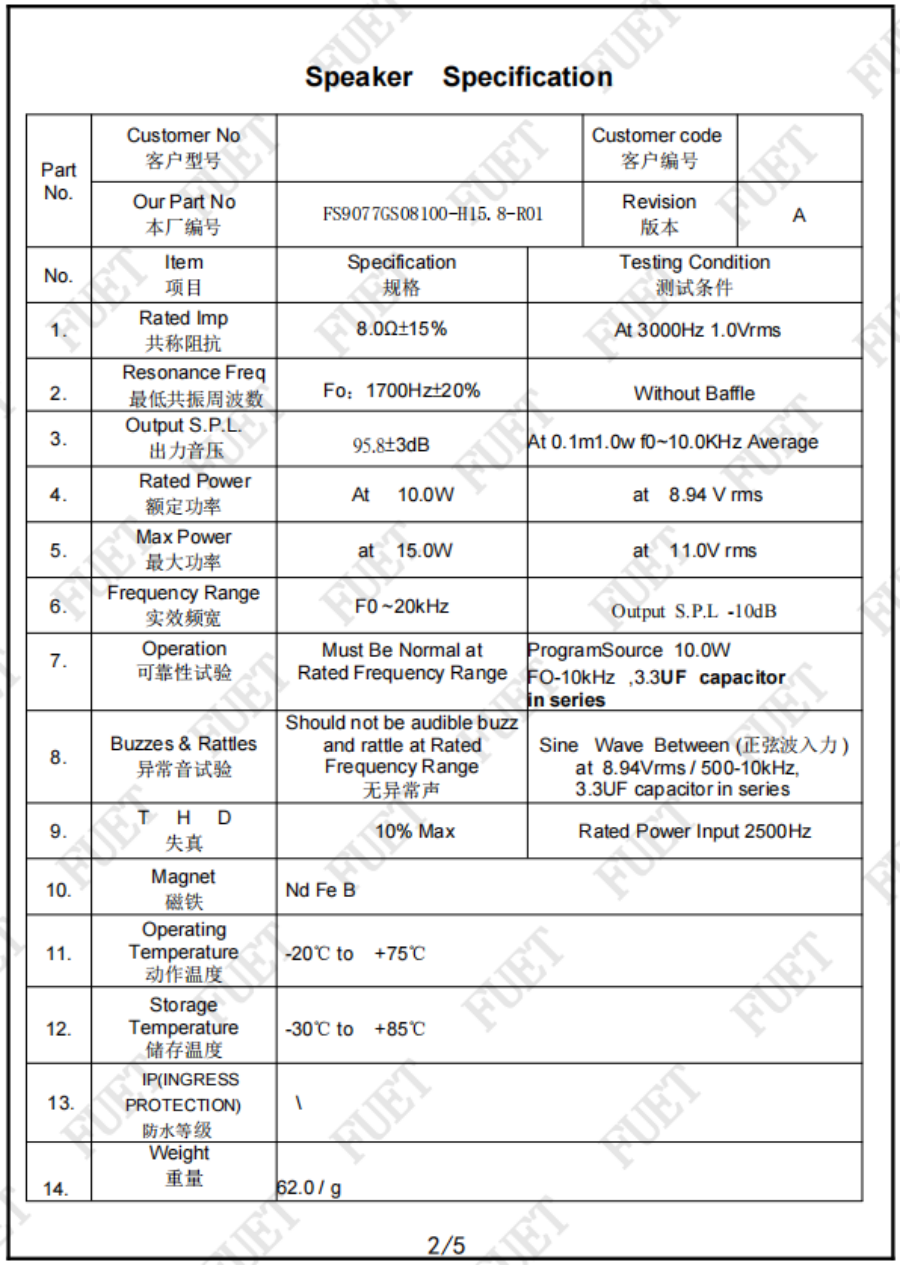 阻抗 | 8.0Ω±15% | At 3000Hz 1.0Vrms |
